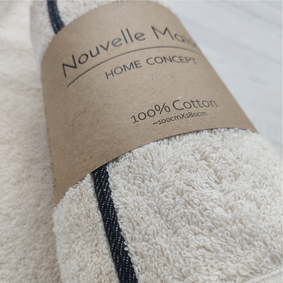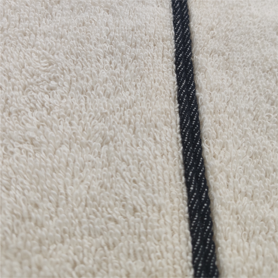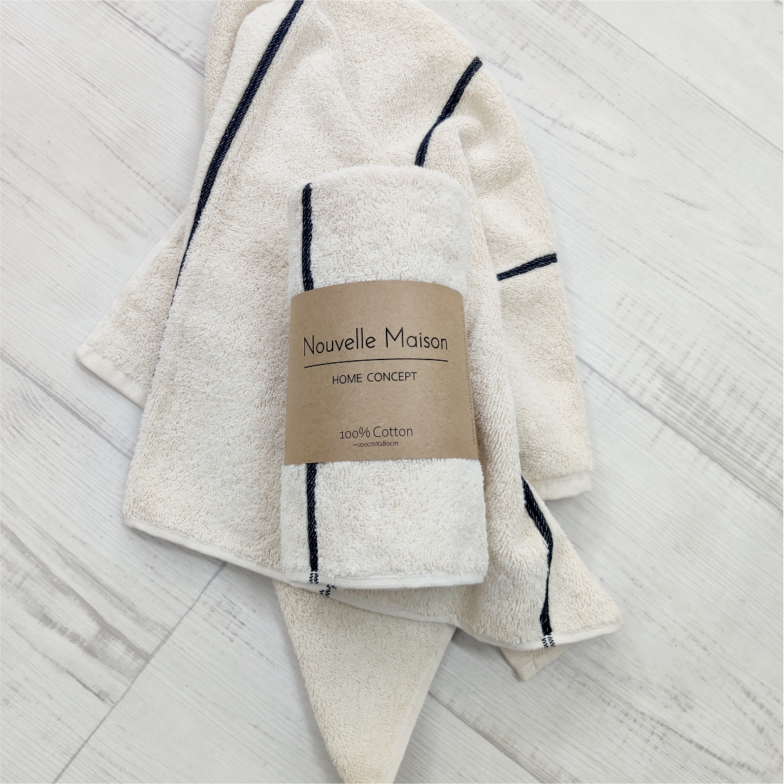 עשויה 100% כותנה מצרית, בצביעת סטון ווש, עם פסים ארוגים לרוחב המגבת.